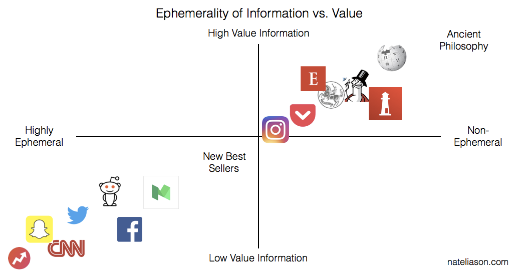 You may be thinking, though, “What’s the point? Why does this matter?” Any time you open Snapchat, turn on the news, pick a book off the bestseller list, you’re making a choice about how you spend your time. There’s an opportunity cost in everything else you don’t spend time on, everywhere else you don’t get information. By picking a highly ephemeral information source, you’re deciding (likely unintentionally) to get lower quality information and to waste your time. By picking non-ephemeral information sources, you get better information in less time.